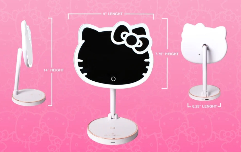 Get ready with the cutest mirror, the Hello Kitty LED Rechargeable Mirror! This mirror is the centerpiece of the Impressions Vanity for Hello Kitty Mirror set. The mirror is shaped after Hello Kitty and outlined with an ultra-bright LED strip light. To power up the mirror, simply tap the circle touch sensor on the mirror. To adjust the brightness, press and hold the touch sensor to your perfect lighting.